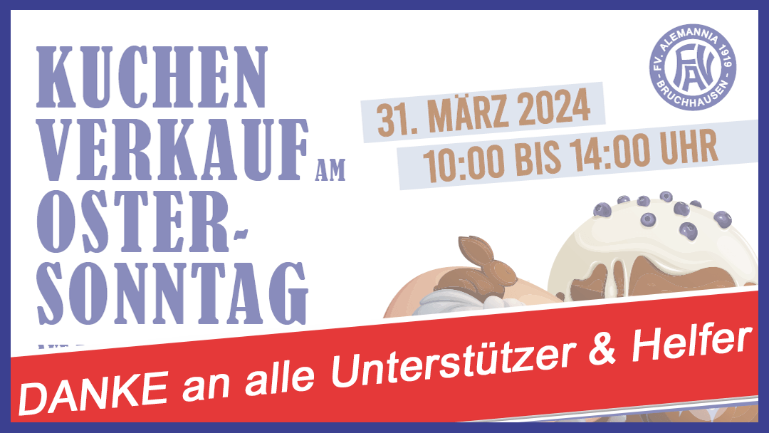 Am Ostersonntag, 31.03.2024, fand zwischen 10.00 und 14.00 Uhr auf dem Gelände des FV Alemannia wieder ein großer Kuchenverkauf zum Mitnehmen statt.