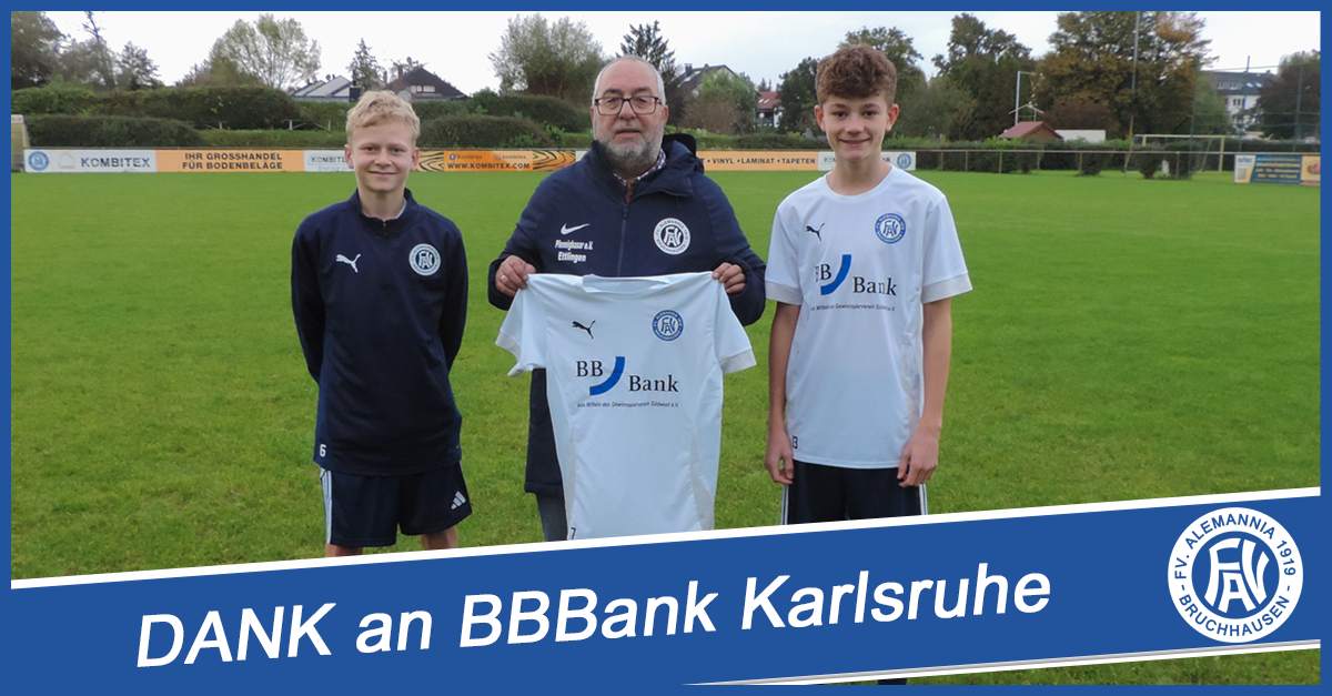 Die Jugendabteilung bedankt sich bei der BBBank Karlsruhe, vertreten durch Herrn Schorb, Leiter der BBBank-Filiale Ettlingen, für die Unterstützung unserer beiden B-Junioren-Mannschaften mit Warm-Up-Shirts