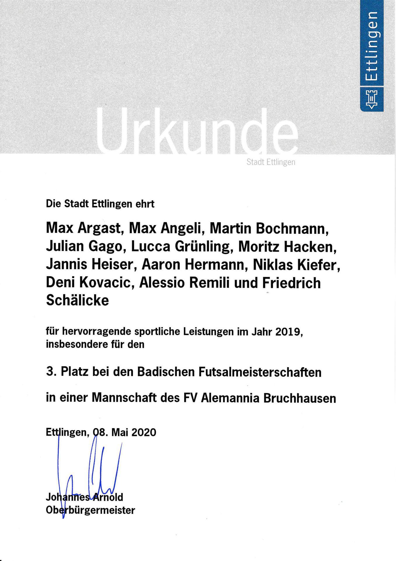 Diese Ehrung bezieht sich auf den 3. Platz bei den Badischen Futsalmeisterschaften der Saison 20018/19.