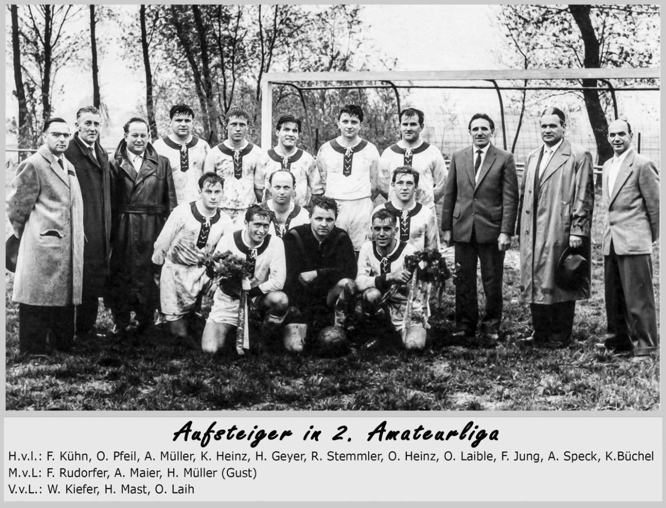 Deutlich spürbar wurde diese gute Jugendarbeit dann im Jahr 1959. Die 1. Mannschaft hatte sich nach der Verbandsrunde mit deutlichem Vorsprung zu den Konkurrenten abgesetzt, wurde Staffelmeister und schaffte den Sprung in die 2. Amateurliga. Für die Verhältnisse des kleinen FV Bruchhausen ein Riesenerfolg, der auch gemessen an der Größe der Gemeinde, als einmalig anzusehen war. Mit diesem sportlichen Erfolg stiegen natürlich auch die Anforderungen an den Verein. Ein längst fälliges Projekt, nämlich die Erstellung von Umkleideräumen und die Installation einer Dusche, duldete keinen längeren Aufschub. Auch hier verhallte der Ruf an die Mitglieder nicht ungehört und so konnte der Bau fast aus schließlich in Eigenarbeit fertiggestellt werden.