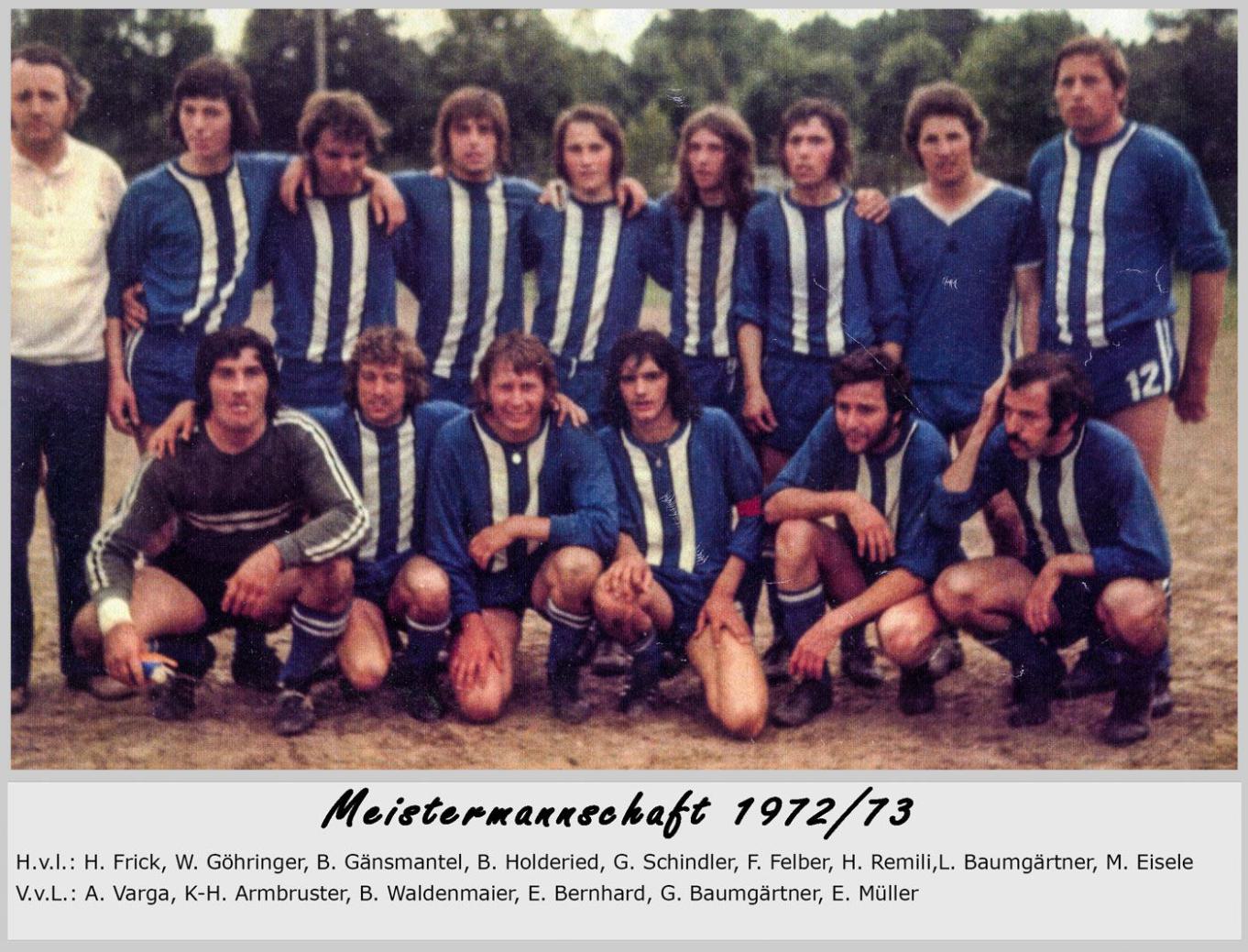 Glücklicherweise fing sich die verjüngte Mannschaft in der Saison 72/73 wieder und schaffte nach spannendem Zweikampf mit dem TV Ettlingen postwendend wieder den Aufstieg. In einem denkwürdigen letzten Saisonspiel siegte man beim FC Albsiedlung mit 5:2 Toren und wurde somit Staffelmeister.