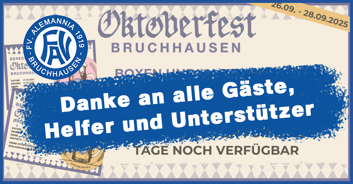 Ein herzliches Dankeschön gilt allen Lieferanten und Partnern, die unser Oktoberfest möglich gemacht haben: der Metzgerei Mohr, der Bäckerei Nussbaumer, der Lebensmittelfundgrube, den Getränkehändlern Volker Kiefer und der Weinhandlung Hinzmann, den Brennereien Rudolphi und Bretzinger sowie der SC Security, dem Roten Kreuz und dem HW Zeltservice, sowie dem Baugeschäft Kiefer für den Verleih von Baugeräten.