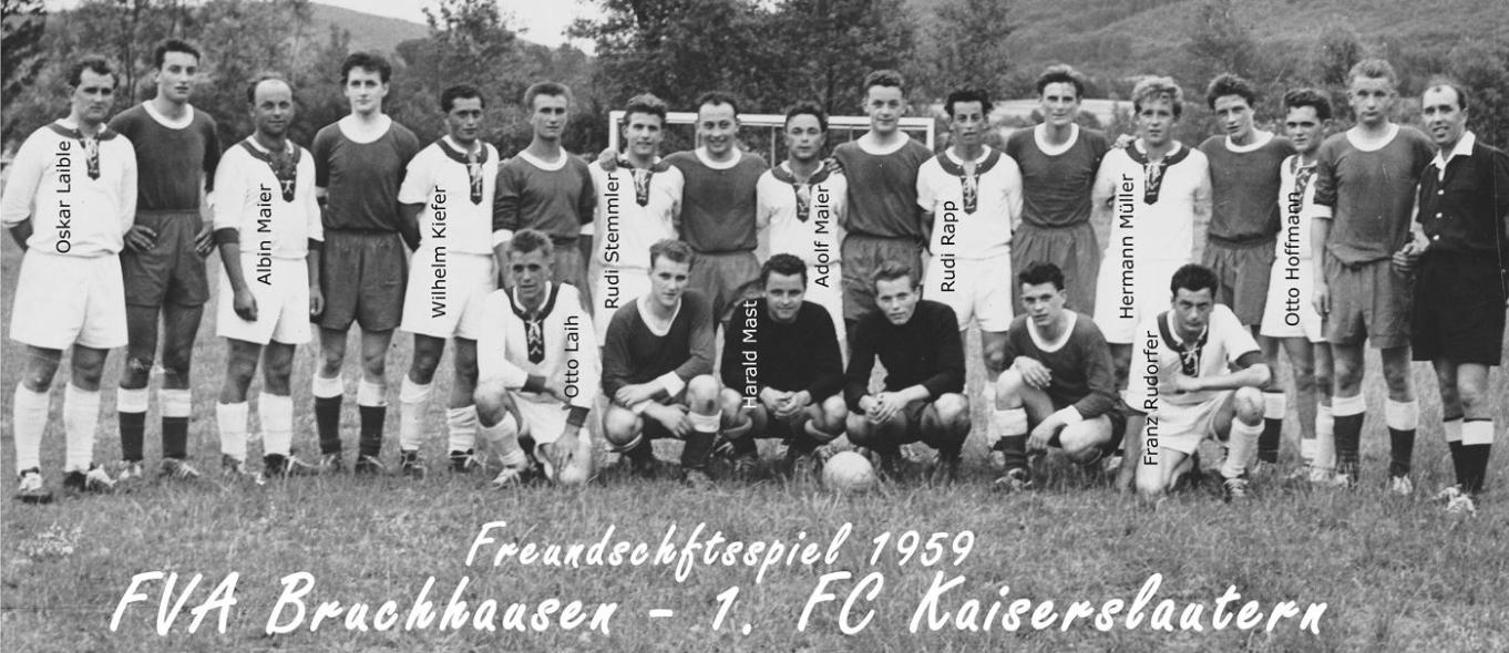 Deutlich spürbar wurde diese gute Jugendarbeit dann im Jahr 1959. Die 1. Mannschaft hatte sich nach der Verbandsrunde mit deutlichem Vorsprung zu den Konkurrenten abgesetzt, wurde Staffelmeister und schaffte den Sprung in die 2. Amateurliga. Für die Verhältnisse des kleinen FV Bruchhausen ein Riesenerfolg, der auch gemessen an der Größe der Gemeinde, als einmalig anzusehen war. Mit diesem sportlichen Erfolg stiegen natürlich auch die Anforderungen an den Verein. Ein längst fälliges Projekt, nämlich die Erstellung von Umkleideräumen und die Installation einer Dusche, duldete keinen längeren Aufschub. Auch hier verhallte der Ruf an die Mitglieder nicht ungehört und so konnte der Bau fast aus schließlich in Eigenarbeit fertiggestellt werden.