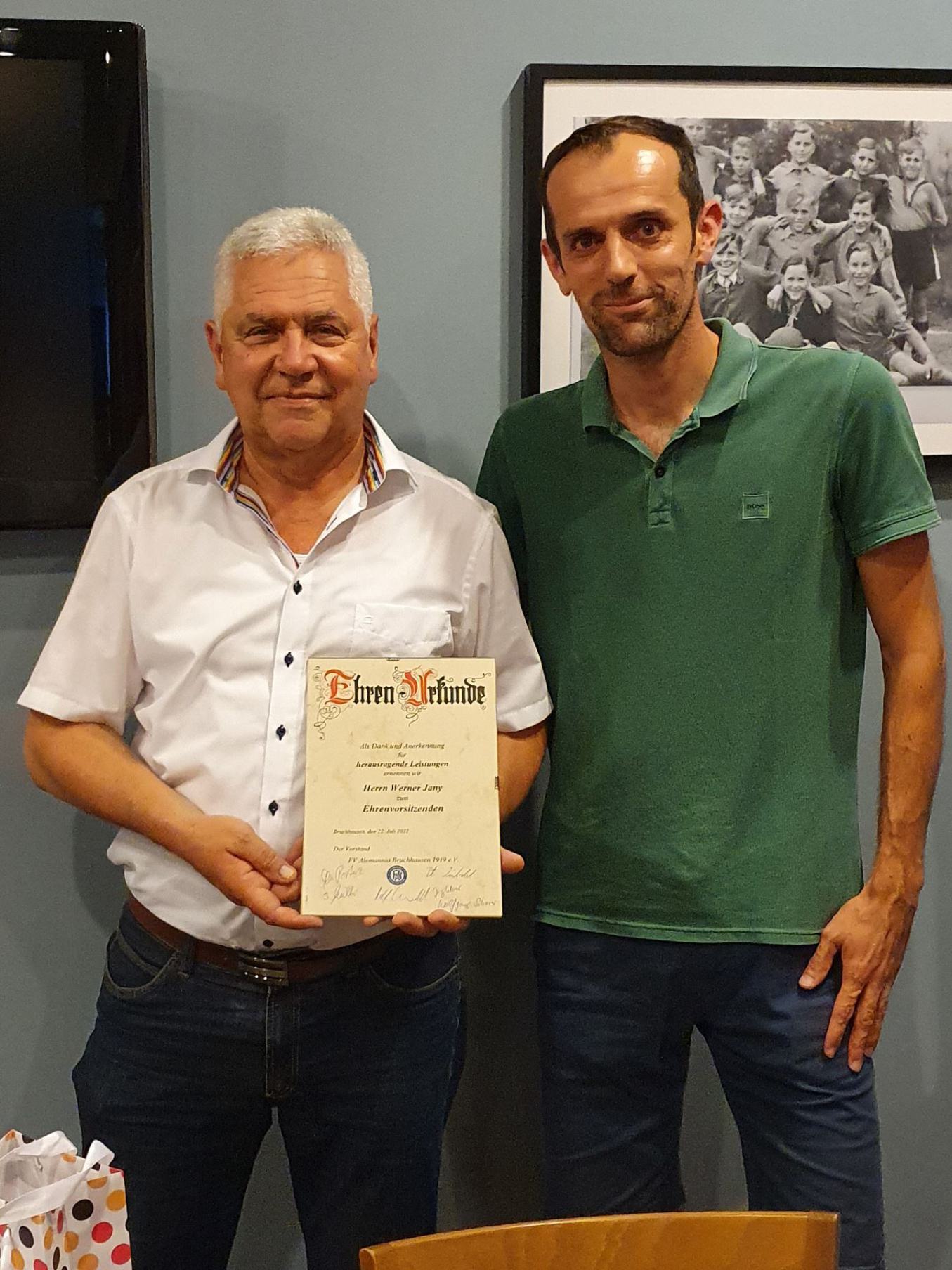 Im Namen der Verwaltung und des gesamten Vereins würdigte Orga Vorstand Sebastian Müller in einer sehr emotionalen Rede nochmals die großartigen Verdienste von Werner Jany für „seinen“ FVA und ernannte ihn unter großem Applaus der Versammlung zum Ehrenvorsitzenden des FV Alemannia Bruchhausen. Eine Auszeichnung die vorher noch niemanden zu Teil wurde und die mehr sagt als alle Worte !!!!