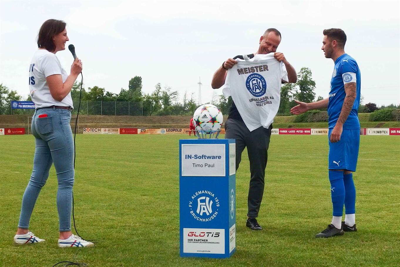 IN-Software Sportmarketing Leiter Timo Paul reiste extra zu diesem Spiel an, um dem FVA eine Ballspende zu überreichen. Ferner durften wir uns auch ganz herzlich für die tollen Meistershirts bedanken, zu denen die Firma IN-Software auch einen großen Anteil gesponsert hat. Die Mannschaft um Nico Heinz wollte Timo Paul nicht gehen lassen ohne sich mit einem Meistershirt zu bedanken.