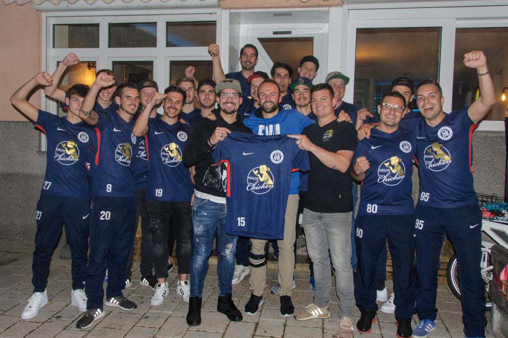 Die Brüder Gondorf, langjährige Freunde von FVA Spielertrainer Christoph Hornberger, haben zur Freude des FVA dessen 1. Mannschaft nun mit einer großzügigen Spende in Form von Warmlauftrikos vor dem Spiel, mit Logo des Lokals unterstützt.
